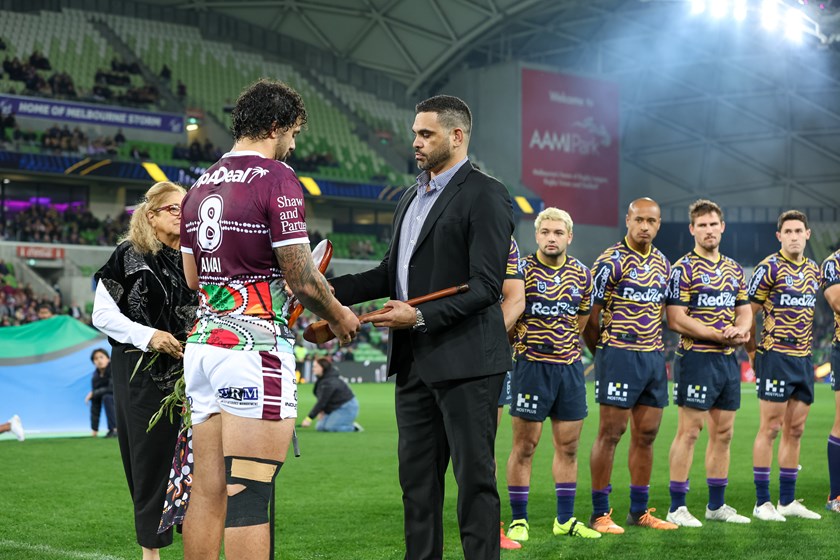 The pair then took part in a cultural gift exchange between the two clubs with Aloiai presenting a fighting shield to Inglis and the Storm club.