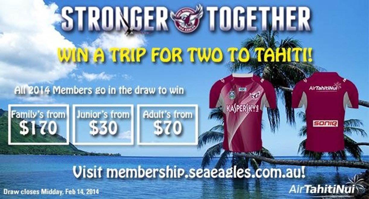 To celebrate the new partnership, Air Tahiti Nui is offering one lucky Sea Eagles Member and a friend a trip to Tahiti including return flights from Sydney and four nights at the Le Meridien Resort Tahiti. All 2014 Members who sign up before Midday, February 14, go in the draw to win the prize.
