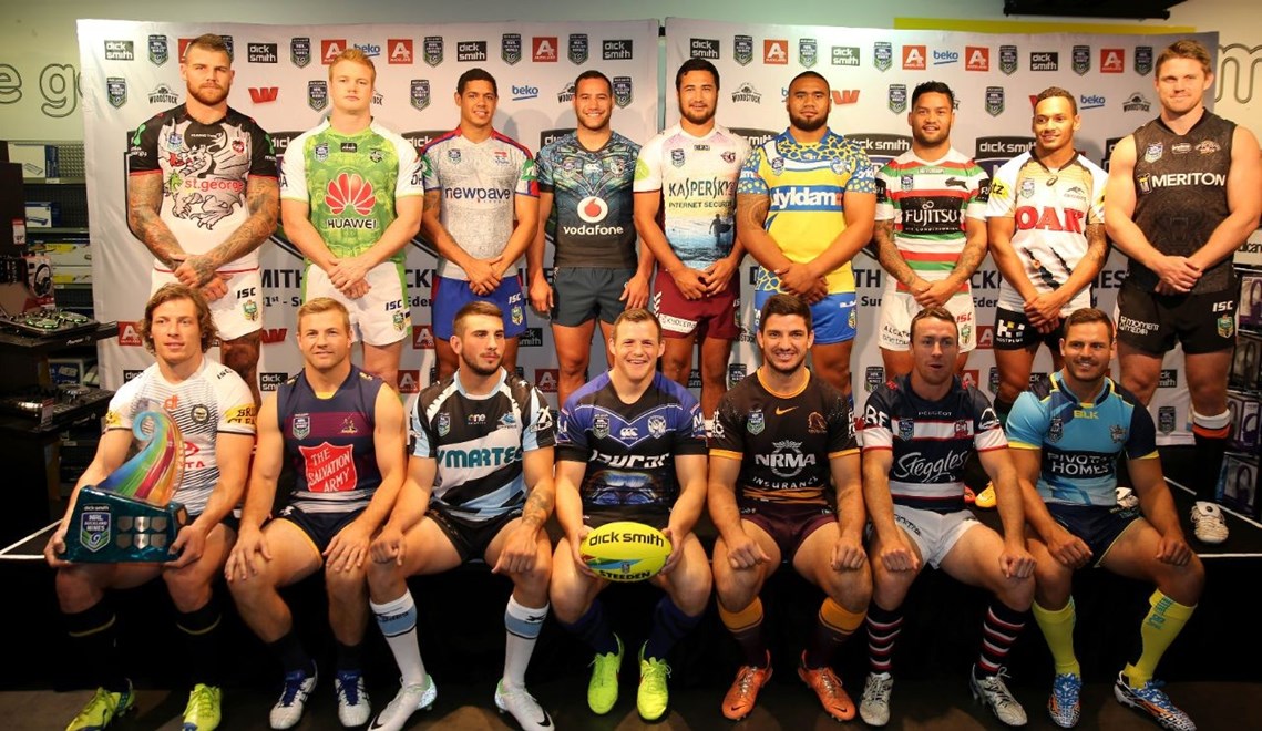 Representative stars James Maloney (Roosters), Issac Luke (Rabbitohs), Brett Morris (Bulldogs), Josh Dugan (Dragons) and Matt Gillett (Broncos), joined NRL Head of Commercial Paul Kind and Dick Smith Director of Marketing Neil Merola to launch the 2015 Nines jerseys at the Dick Smith store on George Street, Sydney.