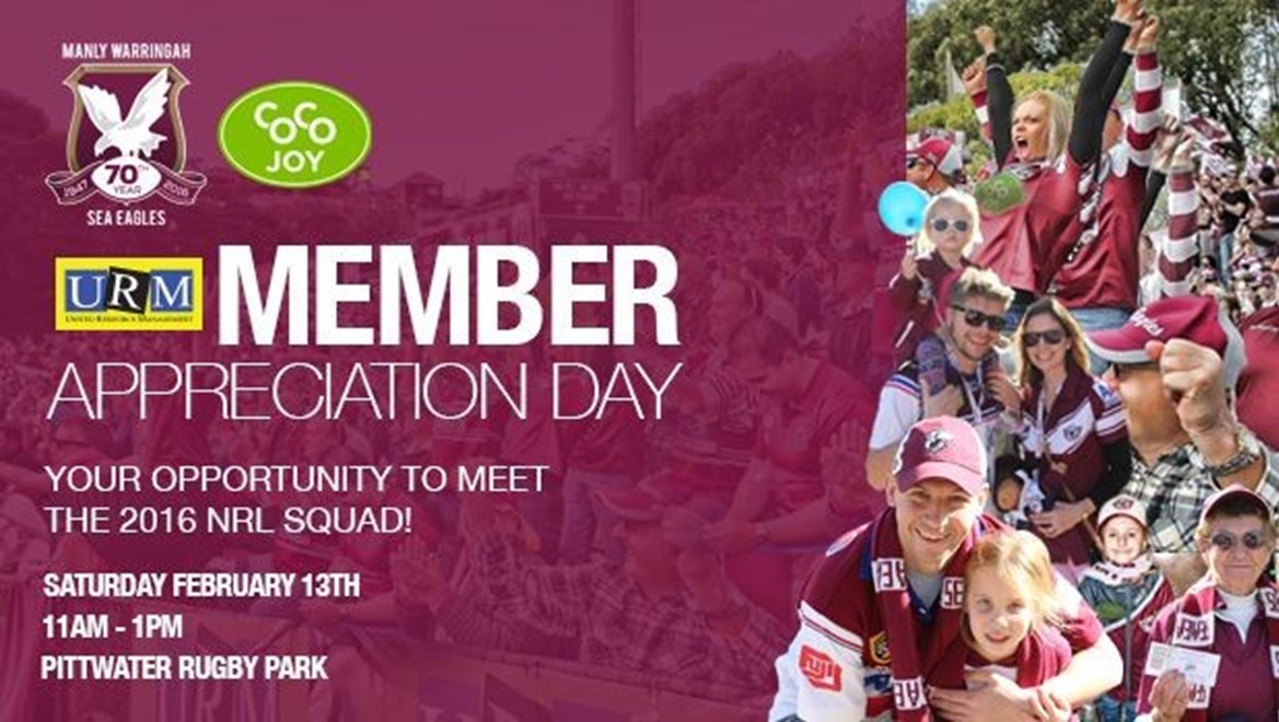 URM Member Appreciation Day This year, we want to thank you for your fantastic support by holding a dedicated day for our loyal Members before the 2016 season officially kicks off. Pittwater Rugby Park will host our inaugural URM Member Appreciation Day on Saturday February 13. This event will be for Members only, so make sure you lock the date into your diary! The event will offer Members the opportunity to meet our 2016 NRL squad and wish them well for the season ahead. Make sure you don't miss out on this opportunity to be one of the first to secure an autograph or photo with the boys in their Manly gear! In addition to being able to meet your favourite Sea Eagles players, the event will be hosted by Club legend Steve Menzies and also feature entertainment and activities for the family. Food and drinks will be available for purchase throughout the day. Please note that only one parent/guardian who is not a 2016 Member will be able to accompany a Junior Member into the event. Simply show your 2016 Membership card upon entry into Pittwater Park and you're good to go! Don't forget to bring a hat and plenty of sunblock as shade will be limited. Further details on the event will be communicated closer to the day. Thank you for your support. Go Manly! Sea Eagles Membership Team Please note: This event will be held the weekend before our 'Pre-Season at the Park' trial match against the Ipswich Jets, also at Pittwater Rugby Park. To purchase tickets for the trial, please click here. |