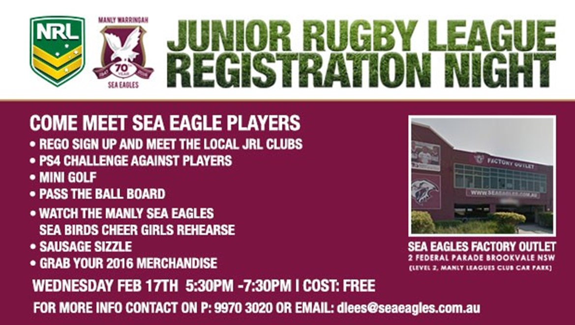 A Junior Rugby League Registration night will be held at the Sea Eagles Factory Outlet on Wednesday, February 17.