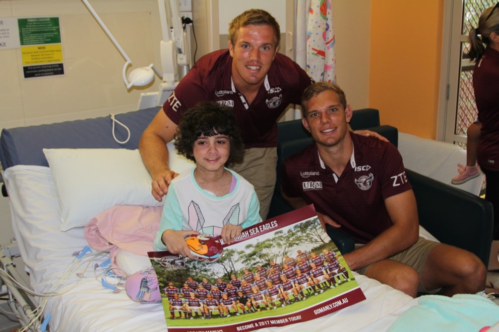 Jake and Tom spend time with Natasha, signing her Manly flag and a team poster. Natasha last year received a hospital visit from Blake Leary and Josh Starling.