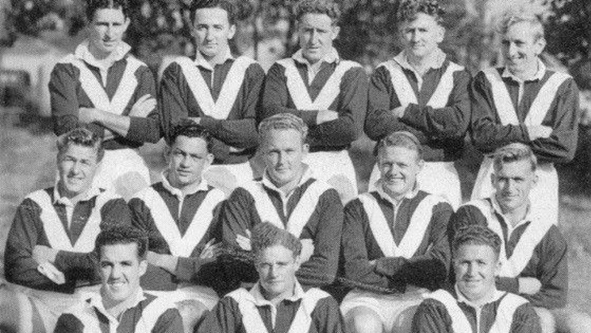 Manly's inaugural first grade team: Back row (l-r) C 'Kelly' McMahon, Merv Gillmer, Keith Kirkwood, Harry Grew, Johnny Bliss (middle row l-r) Jim Hall, A 'Bert' Collins, Max Whitehead (captain), Mackie Campbell, Jim Walsh; front row (l-r) Ern Cannon, Gary Maddrell, Pat Hines.