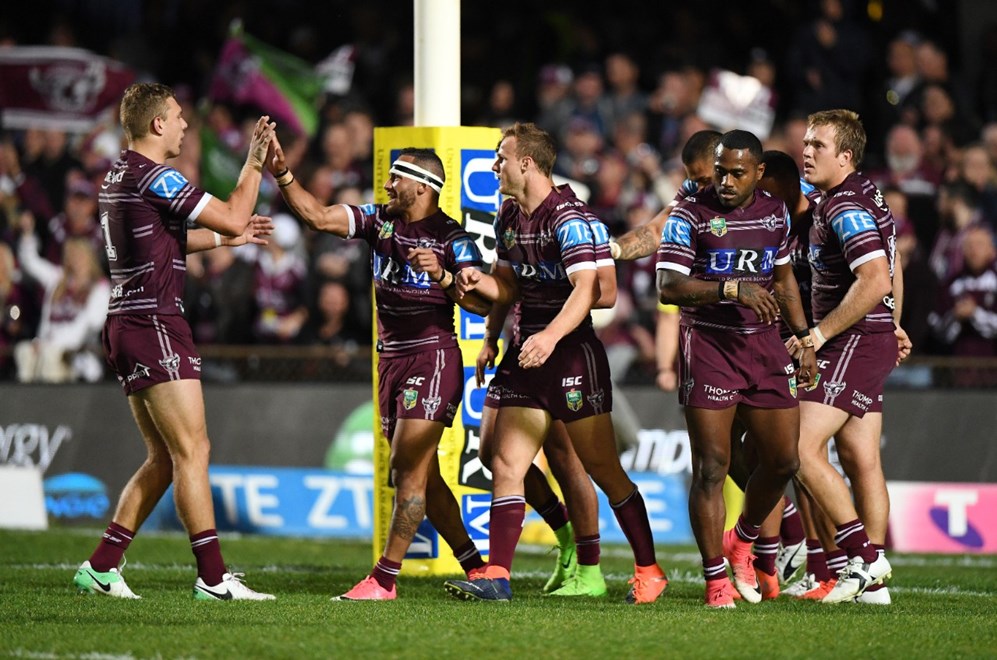 Manly went to a 14-0 lead when lock Jake Trbojevic scored under the posts from an offload by Lloyd Perrett. The NRL Bunker ruled insufficient evidence to overrule the refs call of a try in checking if Trbojevic was held up. Wright converted from in front for a 16-0 lead after 34 minutes.