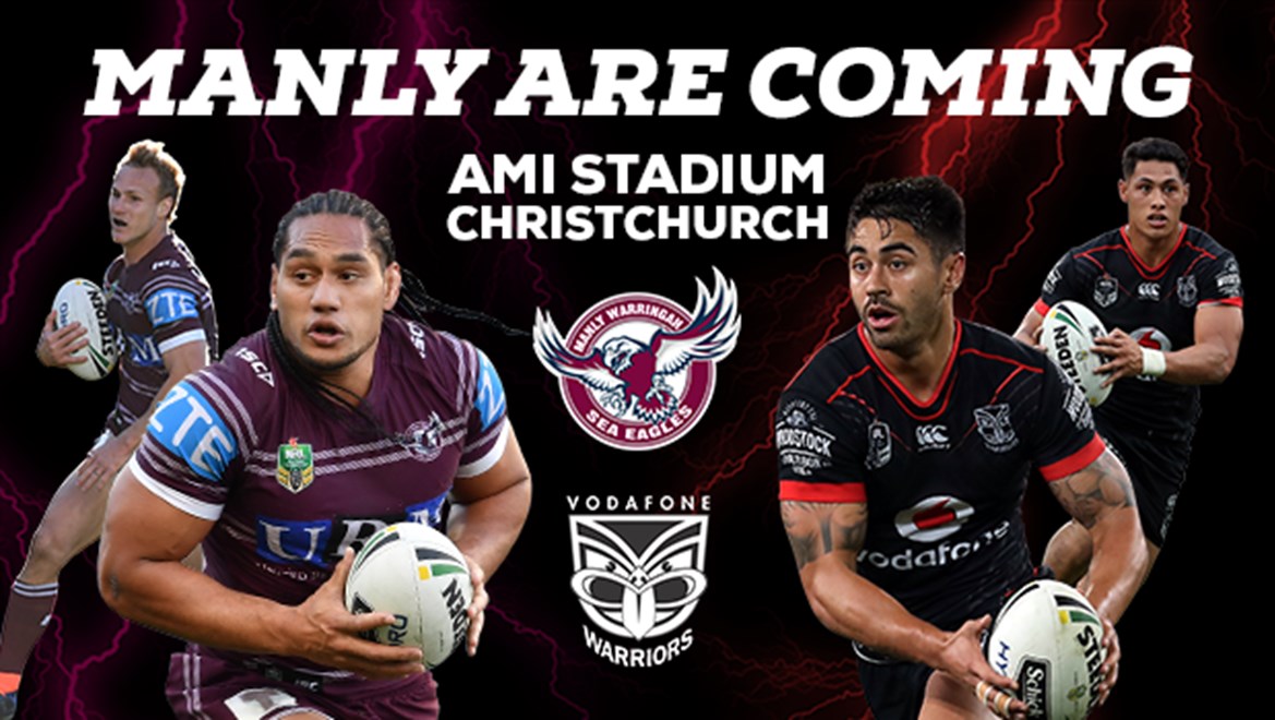 The National Rugby League today confirmed that the Manly Sea Eagles will host the New Zealand Warriors on Saturday, June 9, at 5pm, at AMI Stadium in Christchurch.