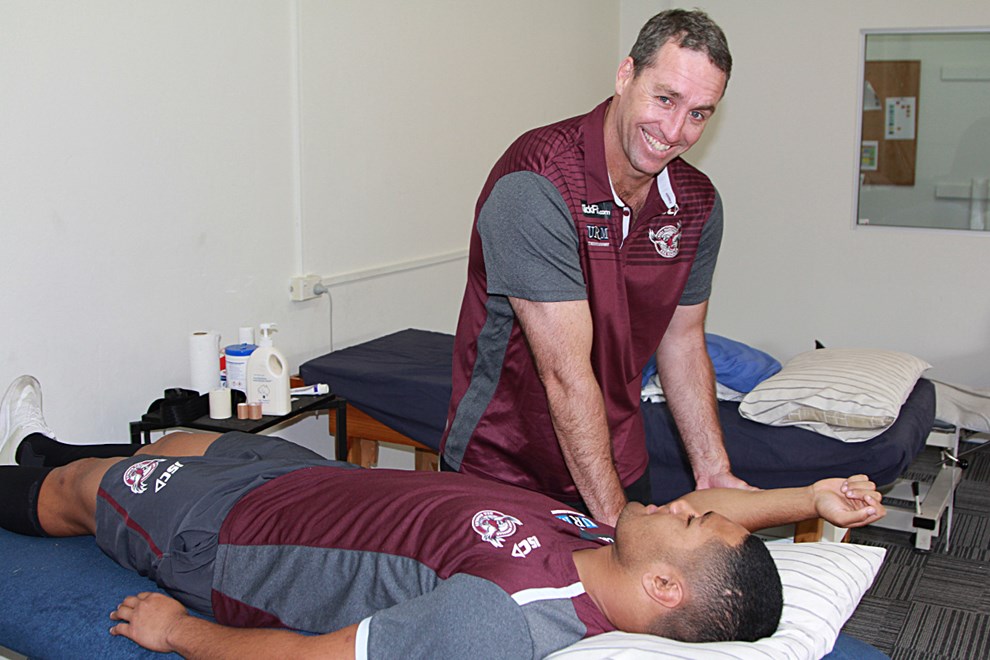 Former Sea Eagles premiership winning forward Daniel Gartner laughs when asked if some of his younger ‘patients’ know of his achievements in the maroon and white jersey.