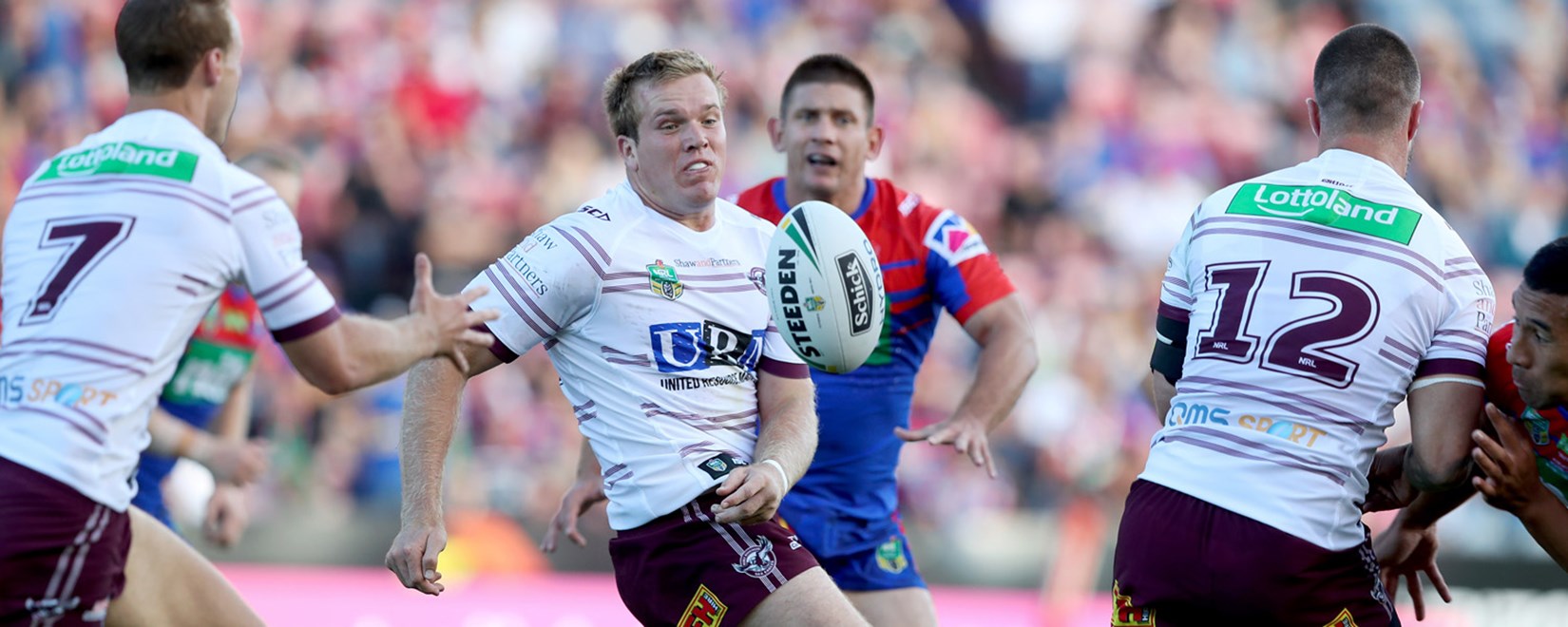On the back of two consecutive penalties in front of the posts, Manly applied the pressure and it told on the Knights when forward Shaun Lane crashed over to score. Cherry-Evans converted for a 12-all scoreline after 38 minutes. The score remained that way to half-time.