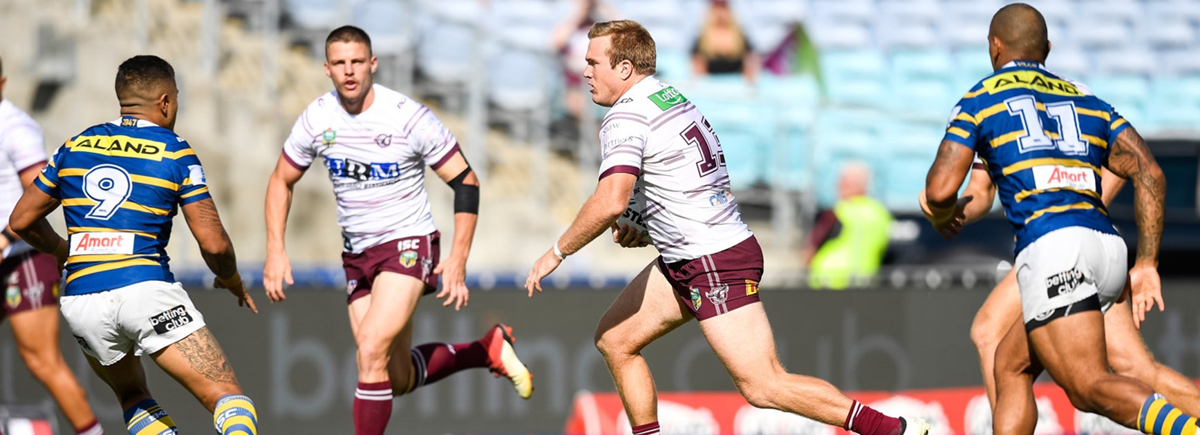 Two minutes later, full-back Tom Trbojevic produced some strong defence to take the Eels over the sideline short of Manly's line.