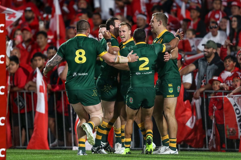 In front of a sold-out Mt Smart Stadium crowd that saw the Tonga fans singing in full voice, the Manly full-back scored both of his tries in the first half playing at right centre in just his fourth Test match for Australia.