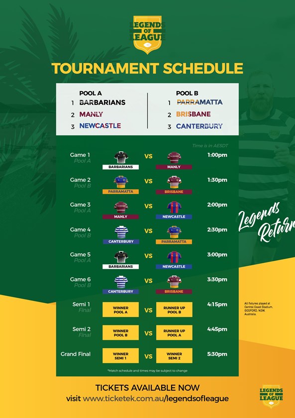 Watch the Legends of League livestream on Saturday Novemeber 17 via the NRL's Facebook page or the tournaments official website legendsofleague.com.au.