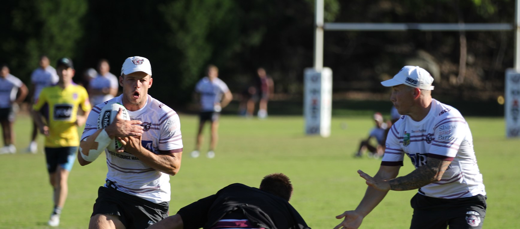 The Manly Sea Eagles and the Blacktown Workers Sea Eagles went hard at it in an opposed session in very humid conditions at Narrabeen on Wednesday. Both teams will feature in trial matches at Lottoland on Saturday, February 23. Photos: Manly Media