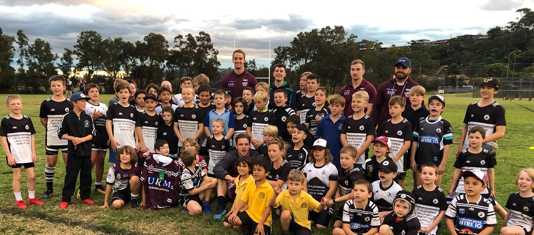 Manly Warringah Sea Eagles players Dylan Walker, Lachlan Croker, Jack Gosiewski, and Sam Smith put some excited young kids from the Narrabeen Sharks JRL Club through a series of fun skills at a Come and Try Rugby League Clinic at Lake Park on Thursday afternoon. The kids then had the chance to have photos and get autographs from the players.