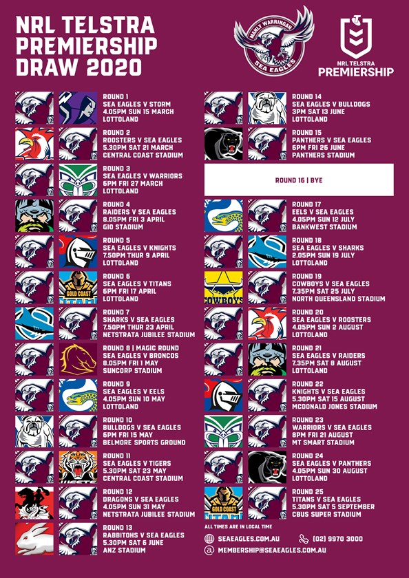 The Sea Eagles will again play 10 home games at Lottoland, kicking off their premiership campaign against arch-rivals Melbourne Storm on Sunday, March 15 at 4.05pm. It will be the only clash between the two teams in the regular season with the match set to be played in front of a huge crowd at Lottoland.