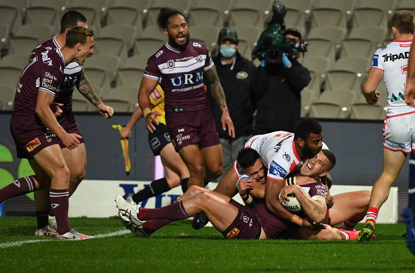 The Sea Eagles were forced to soak up some early pressure on their tryline in the opening three minutes of the second half with the Dragons held up over the line in one set.