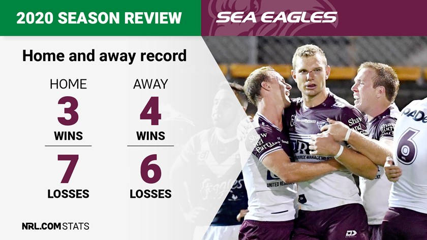 While Manly's away record could have been better, their struggles to win at one-time fortress Lottoland proved particularly costly. Their 3-7 home record looks bad enough but two of those home wins were at Central Coast Stadium during the COVID-19 venue restrictions, leaving them with six losses and just one win (against the Eels) in their own backyard.