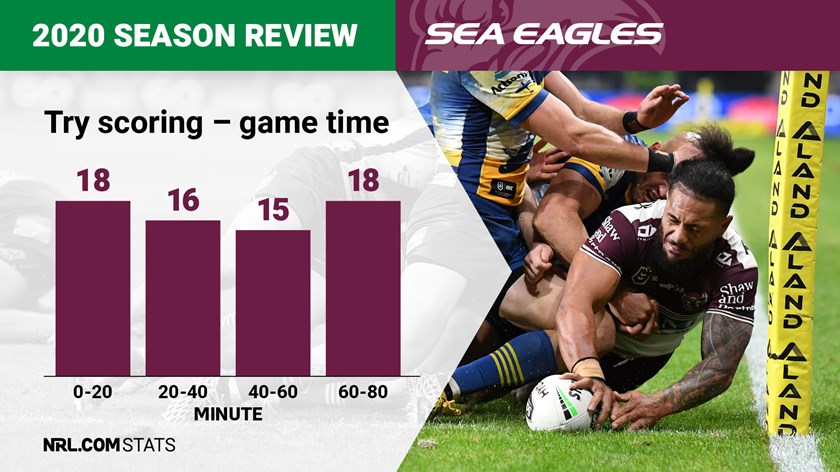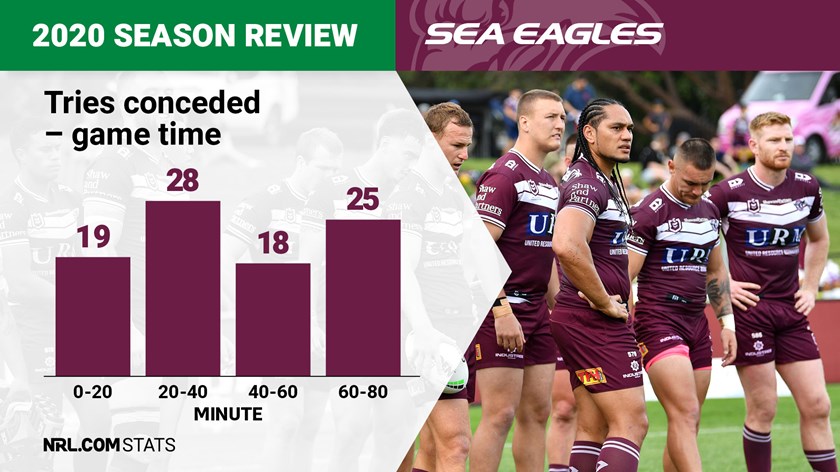 The second 20 minutes of each half, and in particular the final 10 minutes of each half, presented a major threat to the Manly defensive line in 2020. They let in 28 tries from the 20th to 40th minutes and 25 in the final 20 minutes of games.