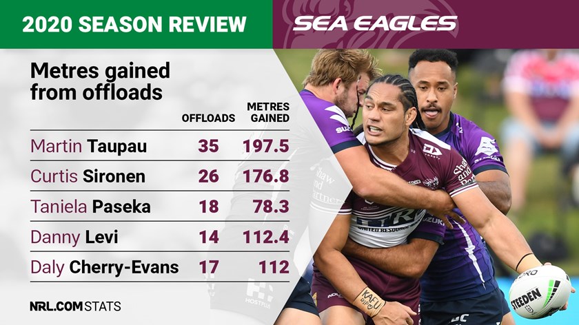 Prop Martin Taupau was the NRL's third most prolific offloader in 2020 with 35, trailing only David Klemmer (45) and Junior Paulo (49), gaining nearly 200 extra metres across the season.