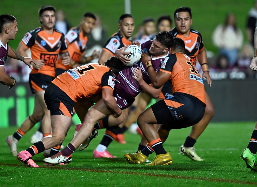 Manly extended their lead to 12-4 when Tylor Bunting stepped through the Tigers defence from and Blake Metcalfe loomed up on the inside to finish the job.