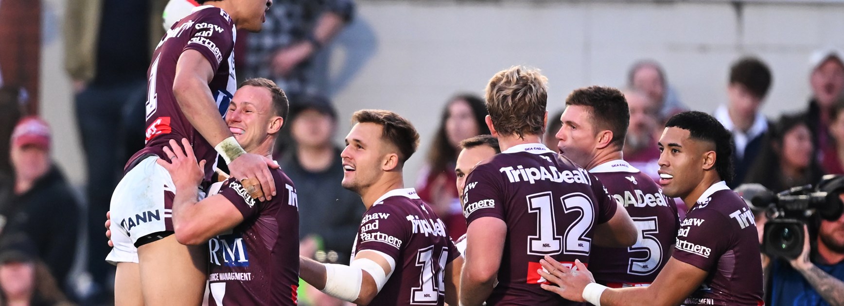 On the back of a repeat set, the Sea Eagles shifted the ball from one side of the field to the other, starting in front of the Hill, and finishing with a try to Reuben Garrick in the 1947 Lounge corner.