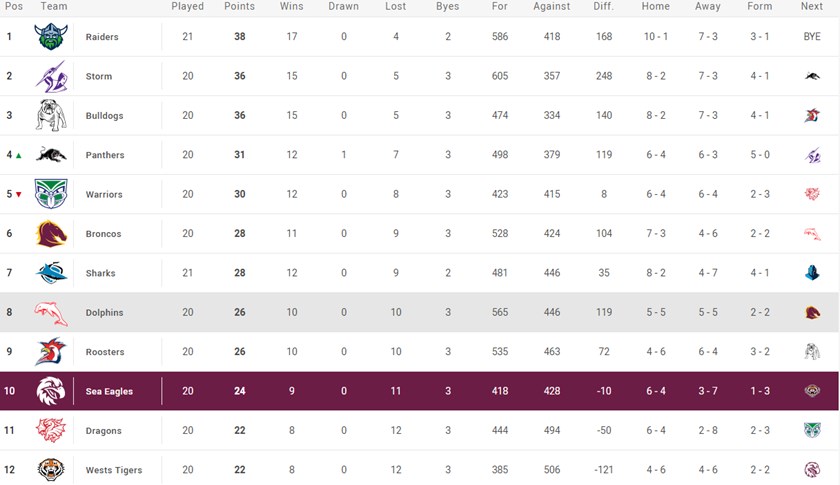 With the Dolphins and Roosters both having a significantly better points differential than Manly, it’s likely the Sea Eagles will need to climb above both teams on competition points. Drawing level won’t cut it.