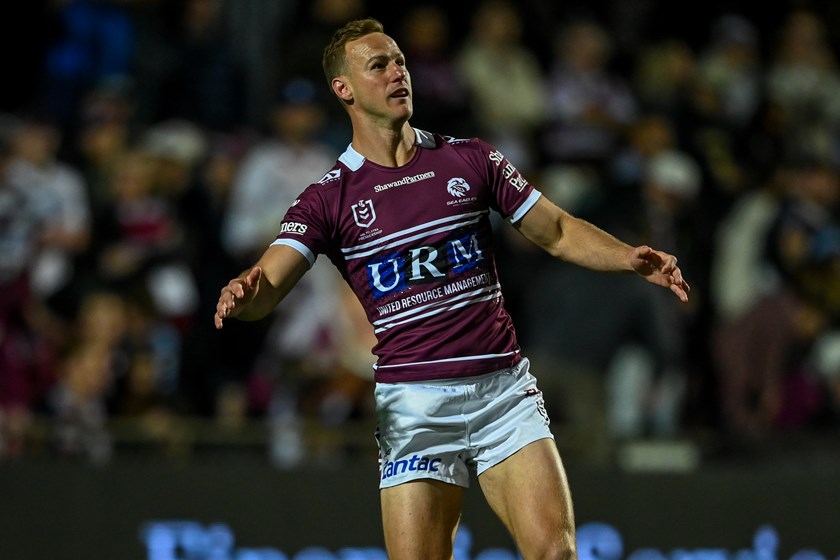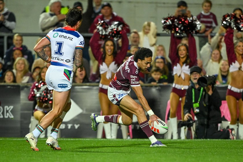 Dallin Watene-Zelezniak was denied a try in the 28th minute after great scrambling defence by Manly saw him put a foot into touch to leave the score at 14-6 to the home side.