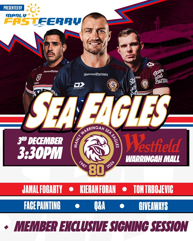 To celebrate this new partnership the Sea Eagles are inviting Members and fans to a special event on Wednesday on 3rd December at Westfield Warringah Mall.