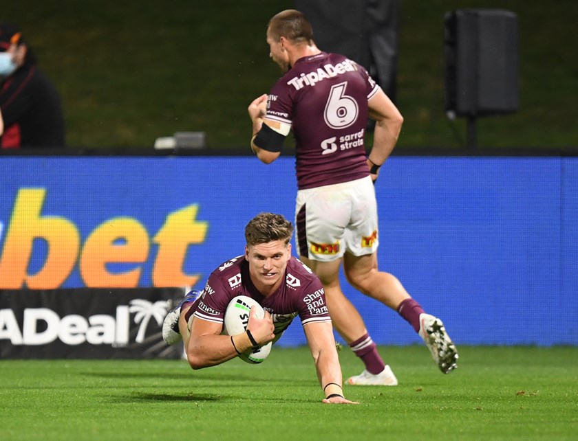 Playing on the wing, Garrick crossed for a hat-trick and kicked eight goals in Manly’s 56-10 win.